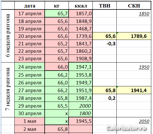 7-я СКН=1866, РКН=1790, ТВН=70,03 Недельное изменение веса -150 (Новый год, три дня с калорийностью под 2000)