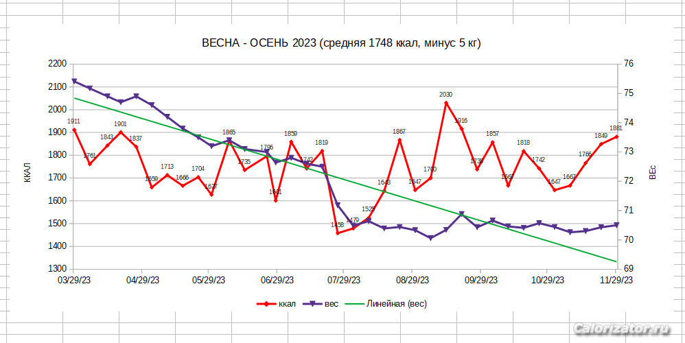 Сделала за последние два года моего пребывания на Калоризаторе графики вес-калорийность.