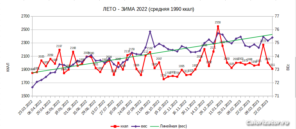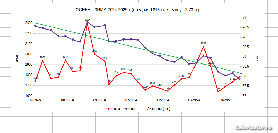 Сделала за последние два года моего пребывания на Калоризаторе графики вес-калорийность.