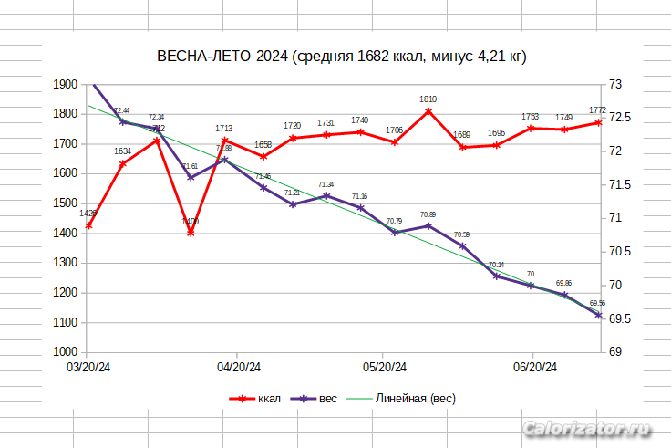 До июля сбросила 4,2 кг уже на более низкой калорийности 1682 ккал , чем в предыдущем году 1748 ккал (разница 66 ккал